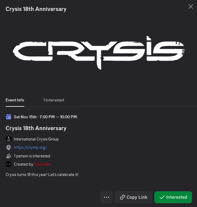 Hello! In case you are not on Discord, let me invite you to the 18th anniversary event. It will take place on November 15 (Saturday) from 19:00 to 22:00 (UTC+1). See you in the game!
